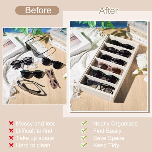 Package Contains: the package includes 4 beige velvet glasses organizer trays, each measuring about 15 x 7.5 x 1.8 inches/ 38 x 19 x 4.5 cm, each having 6 compartments, offering you enough space to accommodate at least 24 sunglasses, Note: please check the size before buying