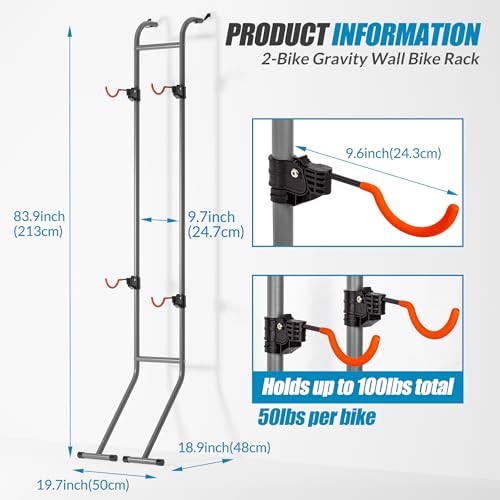 Holds up to 100lbs: The entire bike holder comfortably accommodates 2 bicycles, with a safe load capacity of up to 100 pounds (supporting up to 50 pounds per bike), making it ideal for heavy bikes. The wall-leaning design significantly saves floor space, keeping your home or garage tidy while offering more convenience and space. The overall gray, black, and orange color scheme of the rack is stylish and attractive, fitting a variety of interior design styles