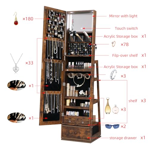 360 Swivel Full Length Mirror Jewelry Cabinet – Standing Armoire With Built-In Mirror & 3 Lockable Drawers (Rustic Brown) – Perfect for Her