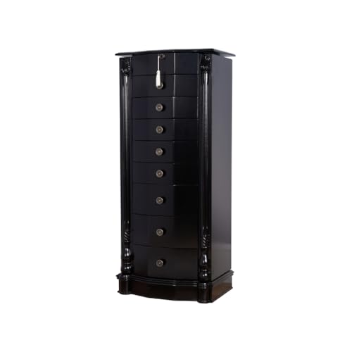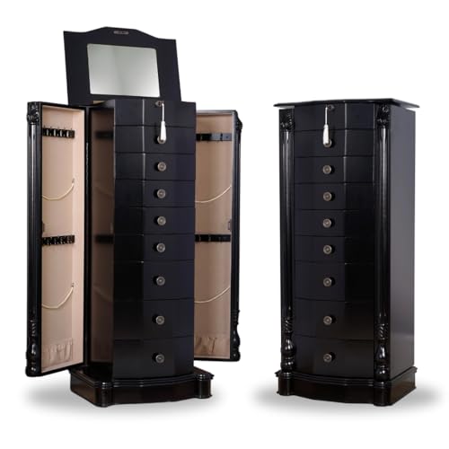 Timeless elegance meets modern functionality in this beautifully crafted Florence Jewelry Armoire. Standing 40 inches tall, it offers ample storage for your entire jewelry collection while enhancing the look of any room. Eight spacious drawers are lined with anti-tarnish felt to keep your accessories organized and protected. The top lid lifts to reveal a vanity mirror, ring rolls, and divided compartments—perfect for everyday accessorizing. Two swing-out side doors feature 10 double-tiered hooks each, providing the ideal setup for tangle-free necklace storage. With a locking lid for added security and a built-in cord access port to manage charging cables discreetly, this armoire combines style, convenience, and smart design.