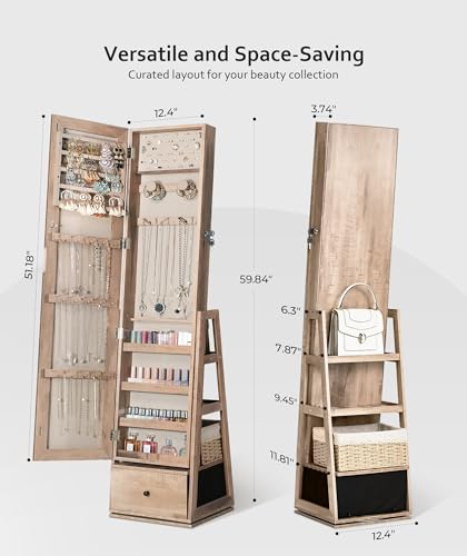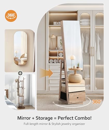 Nicetree 360°Swivel Jewelry Cabinet, Rotatable Full Length Mirror with Jewelry Storage, Standing Jewelry Armoire Organizer, Lockable Jewelry Organizer with 3 Rear Shelves, Bottom Drawer, Toasted Oak