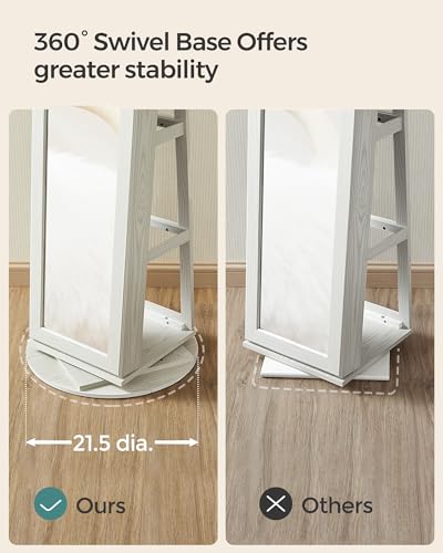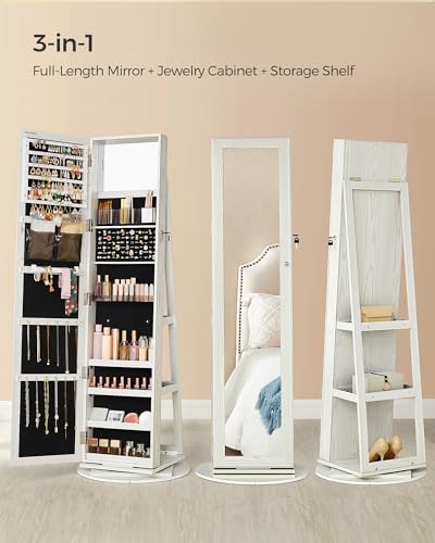 SONGMICS 360° Swivel Jewelry Cabinet, Lockable Jewelry Organizer with Full-Length Mirror, Rear Storage Shelves, Interior Mirror, Jewelry Armoire, Gift Idea, White with Gray Wood Grain UJJC006W01
