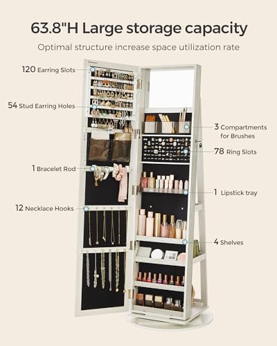 [Ample Storage Space] With 120 earring slots, 54 stud holes, 12 necklace hooks, 78 ring slots, 1 bracelet rod and 4 shelves, both your jewels and makeup have their place in this jewelry organizer