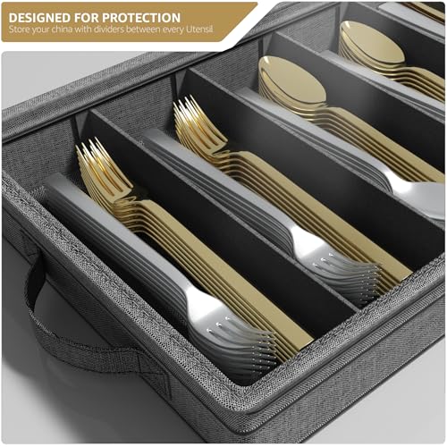 Cutlery Box Cutlery Case Cutlery Storage Durable Design: Holds up to 80 pieces of flatware – Minimal assembly – Top loading design for easy loading/removal – Made of 100% durable polyester (outside), PP cardboard support (inside), and plastic lid (BPA-free) – Flatware in images NOT INCLUDED – Wipe clean – Measures approximately 16.75″ L x 11.25″ W x 3″ H Each Divided section is 2.75” W