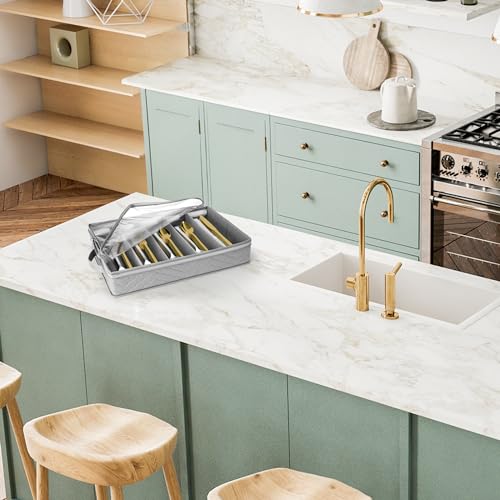 Cutlery Box Cutlery Case Cutlery Storage Durable Design: Holds up to 80 pieces of flatware. Minimal assembly required.Top loading design for easy loading/removal. Smooth glide zipper. Made of non-woven quilted fabric and PP cardboard support (inside). Wipe clean. Measures approximately 15.8″ L x 10.2″ W x 3.3″ H. Each divided section is 2.75” W