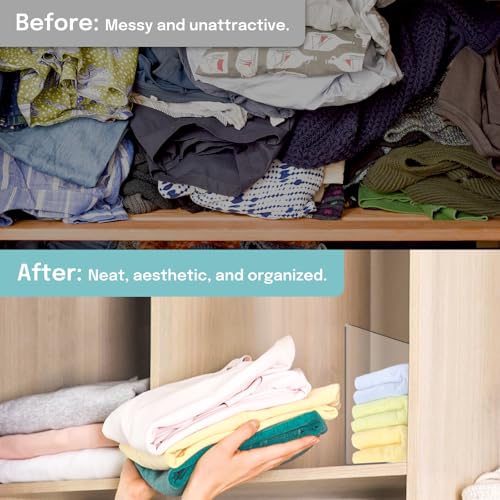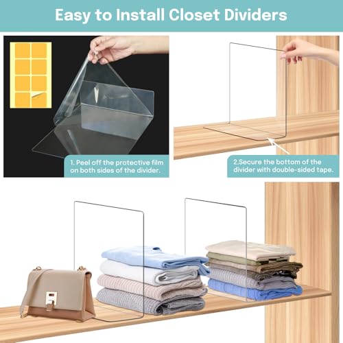Clear Shelf Dividers: Made of high strength acrylic material provide a stylish, sturdy and durable solution for organizing your belongings. The shelf dividers for closet organization help to maximize closet space while keeping items visible and easily accessible, and prevent clothes or towels sliding off shelves. Perfect for organizing closet blankets, purse, shoes, handbags, books, or used for kitchen items.