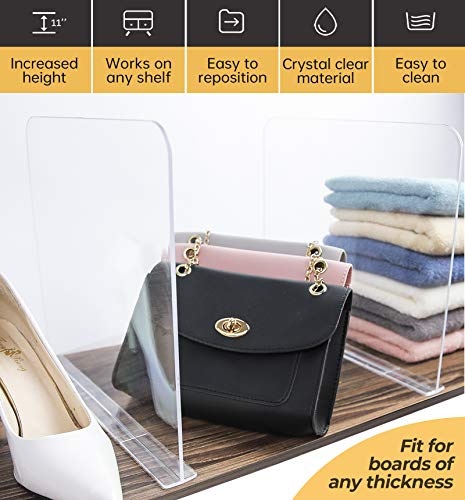 ROUFA 4Pcs Clear Acrylic Shelf Dividers, Adjustable Closet Organizer Fit for Any Thickness of Shelves, Multi-Purpose Wood Shelf Separators for Bedroom, Kitchen, Office, Bathroom, 11.8”x11”