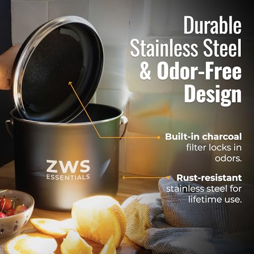CHARCOAL FILTER LID FOR FRESH-SMELLING, ZERO-WASTE KITCHENS: Includes a built-in charcoal filter that locks in odors; keeps your space smelling fresh while you collect organic waste for composting